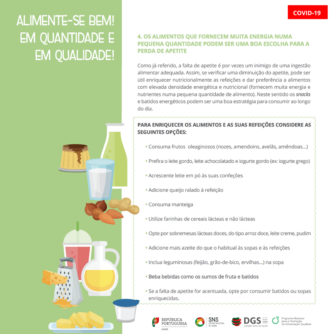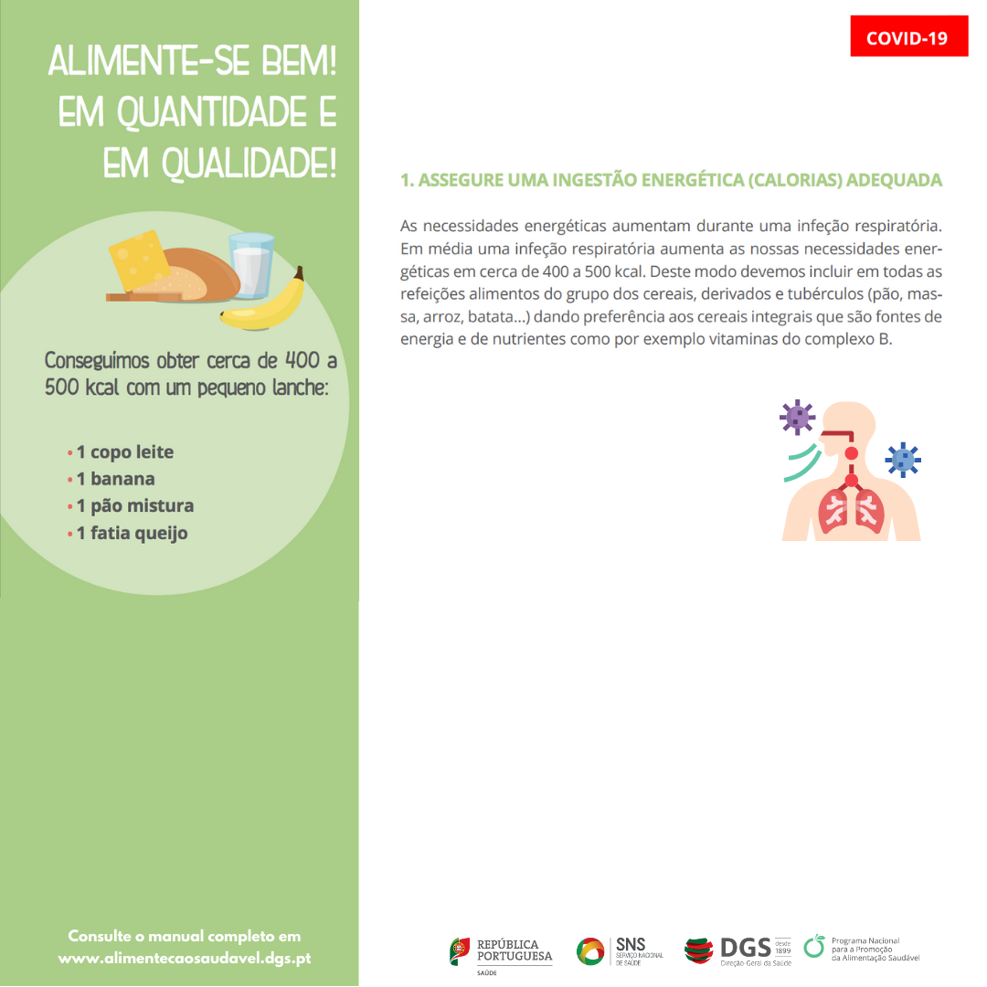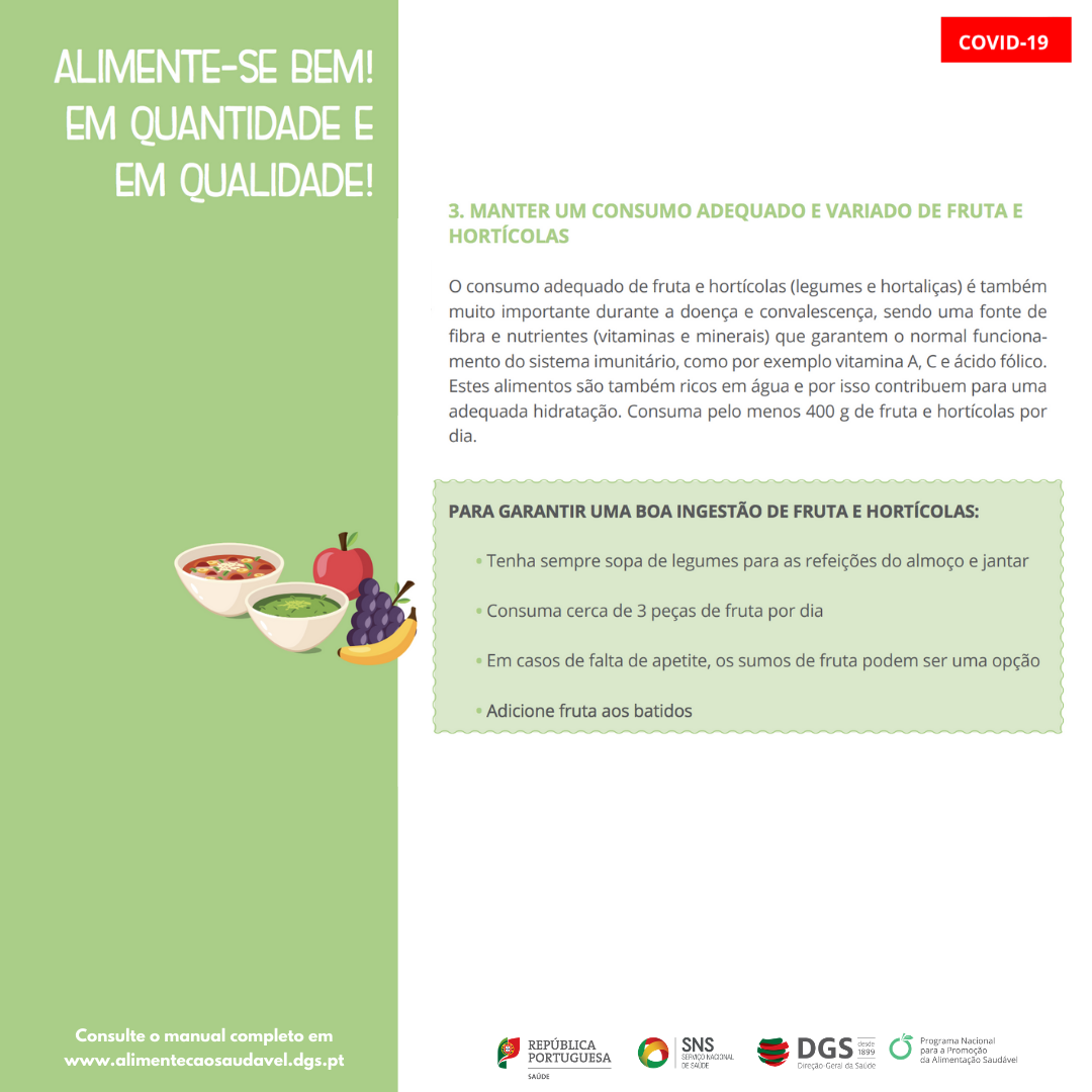 Início Covid-19 Documentos para descarregar documento COVID-19 Idosos COVID-19 e estado nutricional dos idosos Descarregar documento documento COVID-19 Como planear e comprar alimentos Descarregar documento documento COVID-19 EIPAS Receitas Receitas com enlatados Descarregar documento documento COVID-19 Orientação 021/2020: Terapêutica nutricional no doente com COVID-19 Descarregar documento imagem COVID-19 Alimentação e hidratação em doentes com COVID-19 em autocuidados 1 2 Descarregar imagem imagem COVID-19 Alimentação e hidratação em doentes com COVID-19 em autocuidados 11 Descarregar imagem imagem COVID-19 Alimentação e hidratação em doentes com COVID-19 em autocuidados 10 Descarregar imagem imagem COVID-19 Alimentação e hidratação em doentes com COVID-19 em autocuidados 9 Descarregar imagem imagem COVID-19 Alimentação e hidratação em doentes com COVID-19 em autocuidados 8 Descarregar imagem imagem COVID-19 Alimentação e hidratação em doentes com COVID-19 em autocuidados 7 Descarregar imagem imagem COVID-19 Alimentação e hidratação em doentes com COVID-19 em autocuidados 6 Descarregar imagem imagem COVID-19 Alimentação e hidratação em doentes com COVID-19 em autocuidados 5 Descarregar imagem imagem COVID-19 Alimentação e hidratação em doentes com COVID-19 em autocuidados 4 Descarregar imagem imagem COVID-19 Alimentação e hidratação em doentes com COVID-19 em autocuidados 3 Descarregar imagem imagem COVID-19 Alimentação e hidratação em doentes com COVID-19 em autocuidados 2 Descarregar imagem imagem COVID-19 Alimentação e hidratação em doentes com COVID-19 em autocuidados 1 Descarregar imagem documento COVID-19 REACT- COVID Inquérito sobre alimentação e atividade física em contexto de conteção social Descarregar documento documento COVID-19 Manual de intervenção Alimentar e nutricional covid-19 Descarregar documento documento COVID-19 COVID-19 e estado nutricional dos idosos Descarregar documento documento COVID-19 Alimentação e hidratação em doentes com COVID-19 em autocuidados Descarregar documento documento COVID-19 Alimentação e hidratação em doentes com COVID-19 a recuperar em casa após alta hospitalar Descarregar documento documento COVID-19 Orientação 023/2020 – Procedimentos em estabelecimentos de restauração e bebidas Descarregar documento documento COVID-19 Como planear e comprar alimentos? Descarregar documento documento COVID-19 Orientações Serviço de Alimentação – Estruturas Residências para Idosos Descarregar documento documento COVID-19 Orientação DGS – Terapia Nutricional no doente com COVID-19 Descarregar documento documento COVID-19 Receitas com enlatados – Alimentação Saudável em Tempos de Isolamento à base de Conservas de Pescado e Leguminosas Descarregar documento imagem COVID-19 Regras de higiene na cozinha para crianças 1 Descarregar imagem imagem COVID-19 Regras de higiene na cozinha para crianças 2 Descarregar imagem imagem COVID-19 Regras de higiene na cozinha para crianças 3 Descarregar imagem imagem COVID-19 Tarefas para crianças na cozinha Descarregar imagem imagem COVID-19 Tarefas cozinha crianças 3-5 anos Descarregar imagem imagem COVID-19 Tarefas cozinha crianças 6-9 anos Descarregar imagem imagem COVID-19 Tarefas cozinha crianças 10 anos Descarregar imagem imagem COVID-19 Inclua mais fruta e hortícolas na alimentação das crianças Descarregar imagem imagem COVID-19 Dê diferentes formas aos produtos hortícolas Descarregar imagem imagem COVID-19 Reinvente o puré Descarregar imagem imagem COVID-19 Utilize diferentes métodos de confeção Descarregar imagem imagem COVID-19 Prepare sopa de hortícolas Descarregar imagem imagem COVID-19 Prepare saladas coloridas Descarregar imagem imagem COVID-19 Adapte as receitas e inove Descarregar imagem imagem COVID-19 Faça da fruta a sobremesa de excelência Descarregar imagem imagem COVID-19 Inclua fruta no pequeno-almoço e nos lanches Descarregar imagem imagem COVID-19 Seja criativo na apresentação da fruta Descarregar imagem imagem COVID-19 6 Regras Alimentação Saudável Crianças 1 Descarregar imagem imagem COVID-19 6 Regras Alimentação Saudável Crianças 2 Descarregar imagem imagem COVID-19 6 Regras Alimentação Saudável Crianças 3 Descarregar imagem imagem COVID-19 6 Regras Alimentação Saudável Crianças 4 Descarregar imagem imagem COVID-19 6 Regras Alimentação Saudável Crianças 5 Descarregar imagem imagem COVID-19 6 Regras Alimentação Saudável Crianças 6 Descarregar imagem imagem COVID-19 6 Regras Alimentação Saudável Crianças 7 Descarregar imagem imagem COVID-19 6 Passos Alimentação Saudável 1 Descarregar imagem imagem COVID-19 6 Passos Alimentação Saudável 2 Descarregar imagem imagem COVID-19 6 Passos Alimentação Saudável 3 Descarregar imagem imagem COVID-19 6 Passos Alimentação Saudável 4 Descarregar imagem imagem COVID-19 6 Passos Alimentação Saudável 5 Descarregar imagem imagem COVID-19 6 Passos Alimentação Saudável 6 Descarregar imagem imagem COVID-19 6 Passos Alimentação Saudável 7 Descarregar imagem imagem COVID-19 Higiene e Segurança Alimentar 1 Descarregar imagem imagem COVID-19 Higiene e Segurança Alimentar 2 Descarregar imagem imagem COVID-19 Higiene e Segurança Alimentar 3 Descarregar imagem imagem COVID-19 Higiene e Segurança Alimentar 4 Descarregar imagem imagem COVID-19 Higiene e Segurança Alimentar 5 Descarregar imagem imagem COVID-19 Higiene e Segurança Alimentar 6 Descarregar imagem documento COVID-19 O SARS-COV-2 (novo coronavírus) pode ser transmitido através dos alimentos? Descarregar documento imagem COVID-19 Seja um consumidor responsável, compre apenas o que precisa Descarregar imagem documento COVID-19 COVID-19 Orientações na área da Alimentação Descarregar documento documento COVID-19 Vamos por a Alimentação saudável ON em Casa Descarregar documento documento COVID-19 Máquinas venda automática Orientações Seguran