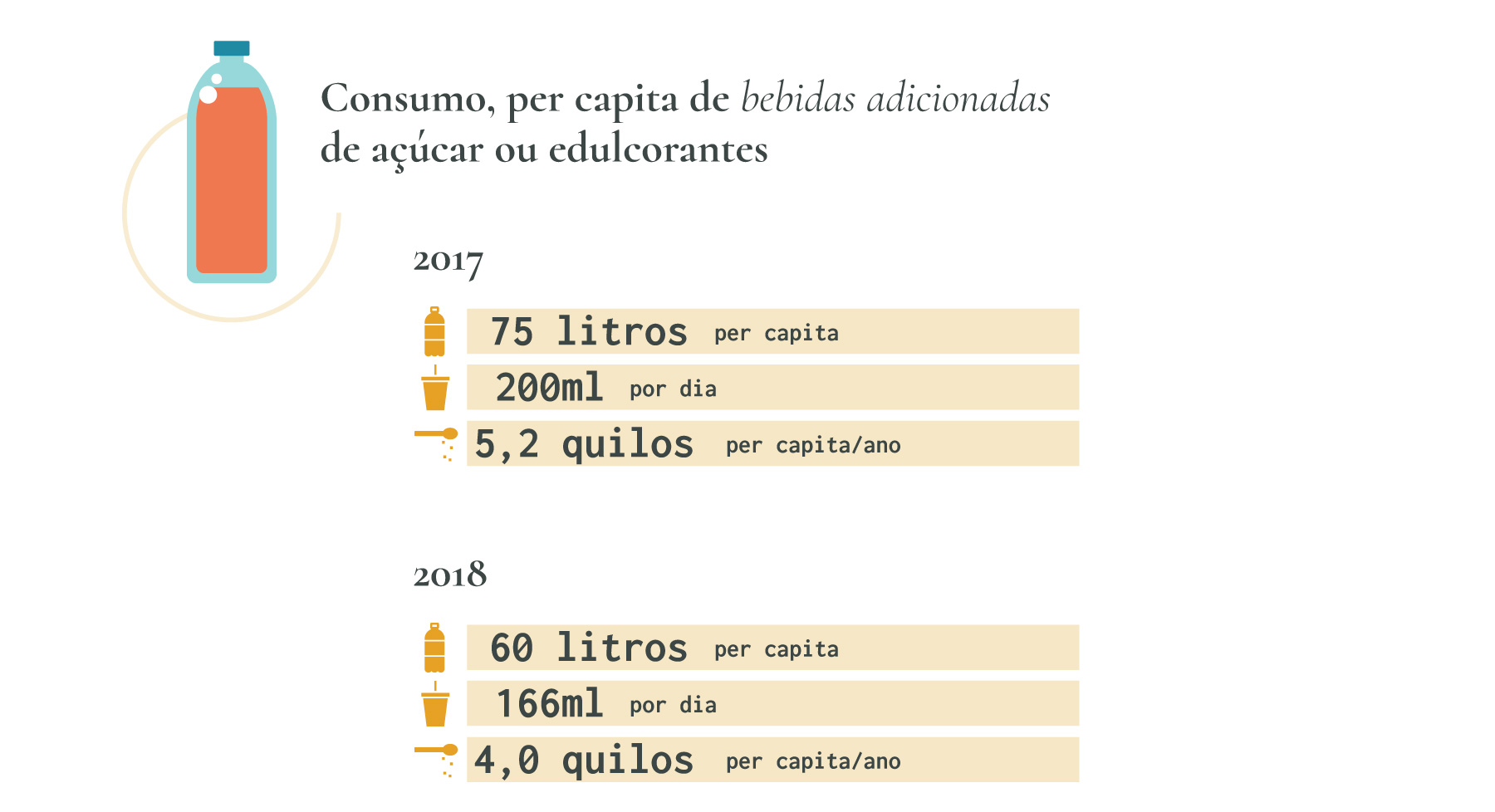 Dados de consumo per capita por ano de bebidas refrigerantes, mostram um decréscimo durante o período de 2017 e 2018, bem como um decréscimo no consumo de açúcar através do consumo destas bebidas (5,2 g de açúcar consumido por ano per capita através destas bebidas em 2017, e 4,0 kg em 2018). O decréscimo das quantidades de açucares pode estar relacionado com uma mudança dos padrões de consumo dos portugueses ou com a reformulação dos produtos.