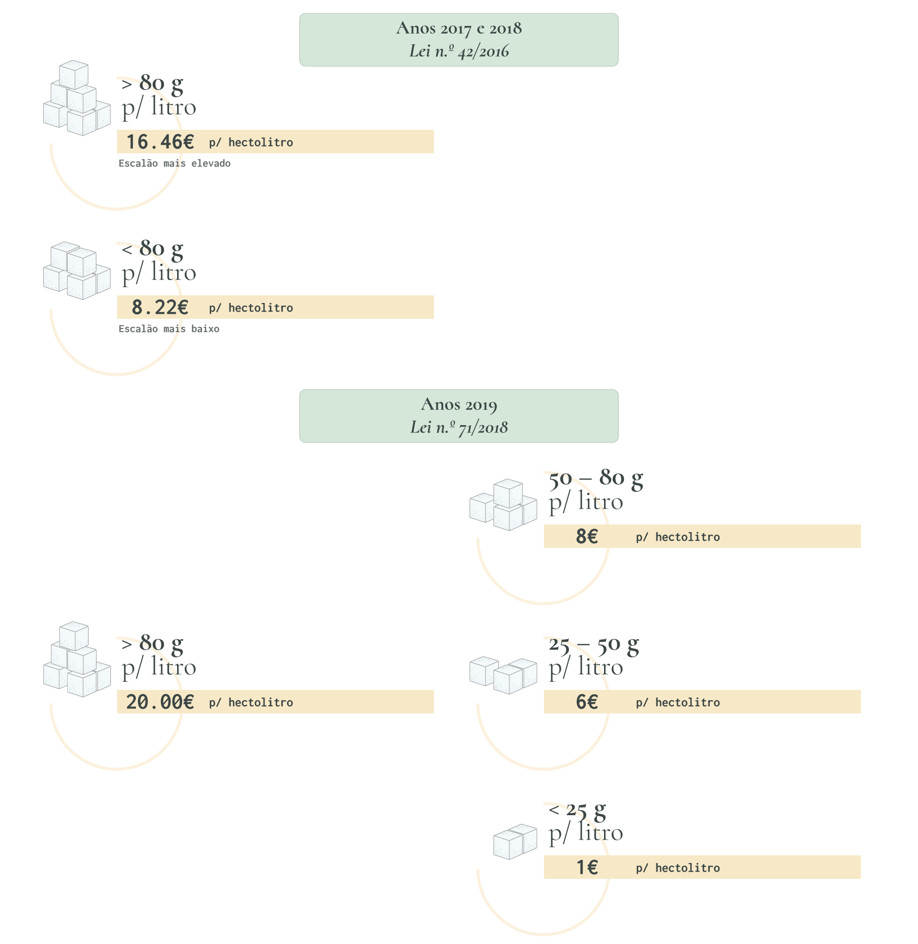 € 20/hl – bebidas com o teor de açúcar igual ou superior a 80 gramas por litro.